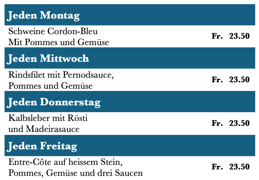 wo wir Ihnen das Beste der Schweizer Küche auf den Tisch bringen. Unsere Speisekarte ist von traditionellen Schweizer Gerichten inspiriert und wird nur mit den frischesten Zutaten zubereitet.